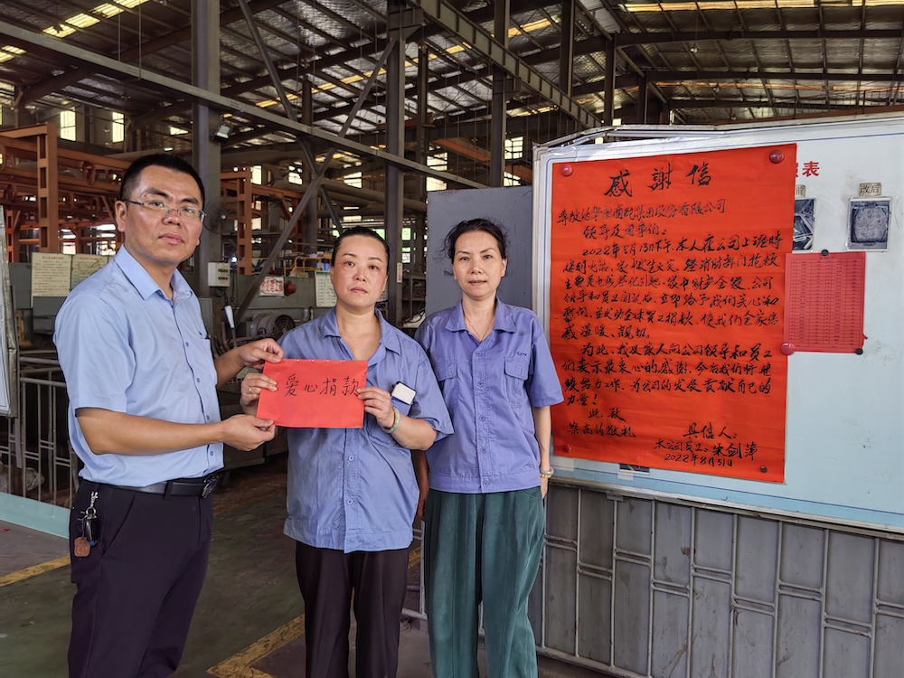 8月13日下午,正在上班的環(huán)鑄車間員工朱劍萍同志接到電話,得知家中發(fā)生火災,一場無情的大火,讓整套房屋被燒毀,房屋內(nèi)物件無一幸免。公司領導和同事們聞訊后立即給予關心和慰問,公司工會第一時間送上慰問金,同時向市總工會申請“臨時致困補助”,分工會發(fā)動全體員工進行愛心捐款。無情大火有情人,讓朱劍萍深深感受到華閩南配這個大家庭溫暖的力量。